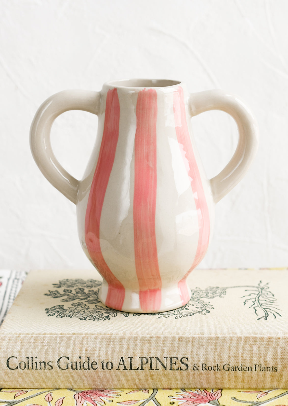 This sculptural vase gets a playful look from side handles and a painterly design — choose from pink stripes or green dots.