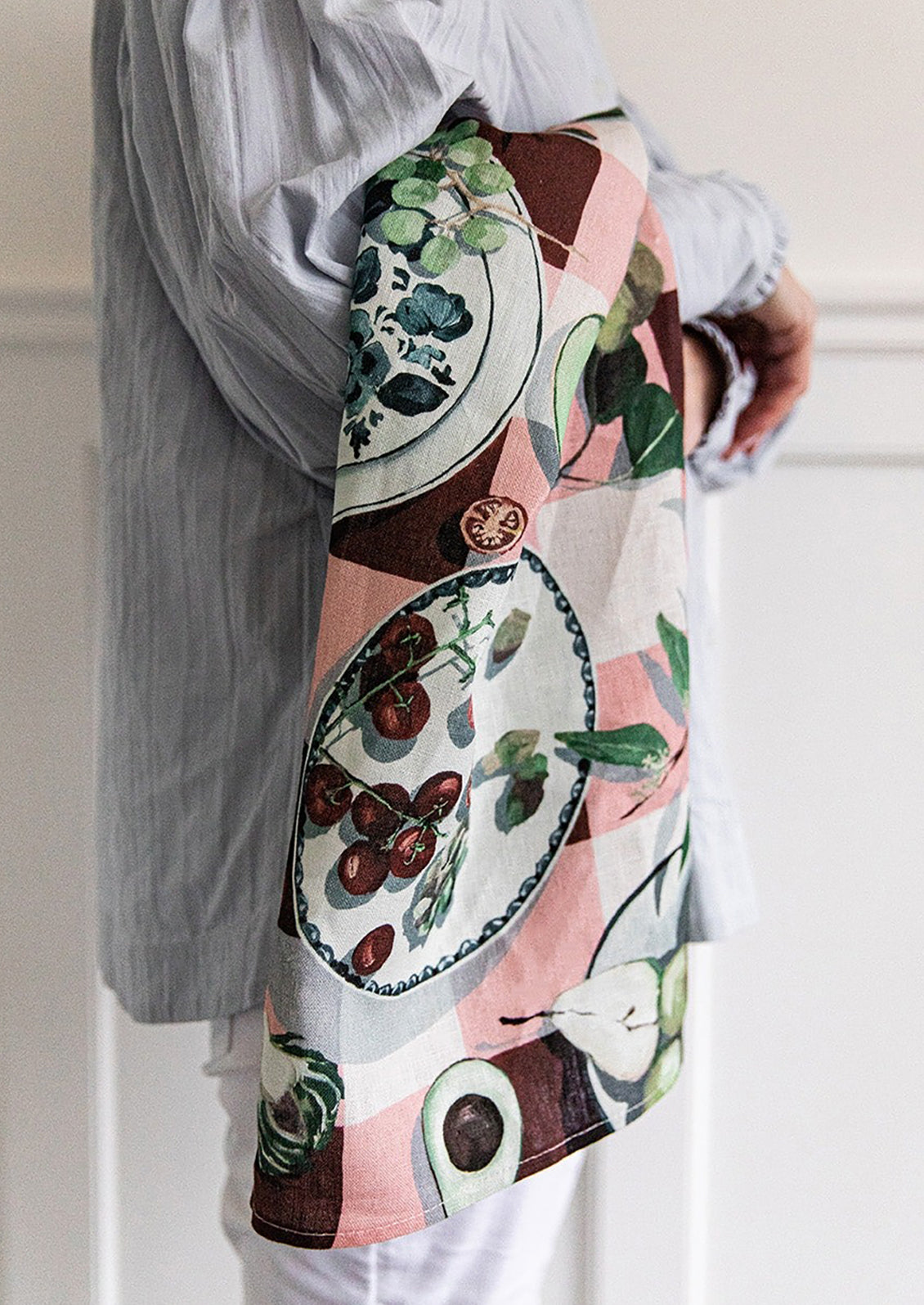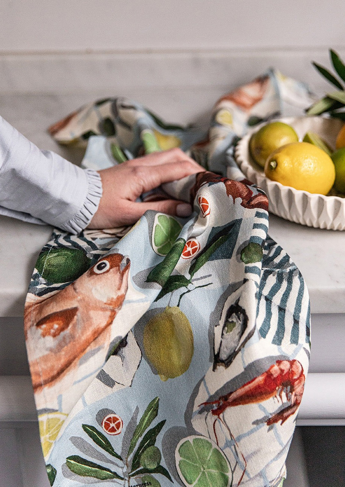 Printed with lively, tablescape-themed prints abundant with fruits, fish, vegetables and more, this linen tea towel is a work of art for the kitchen.